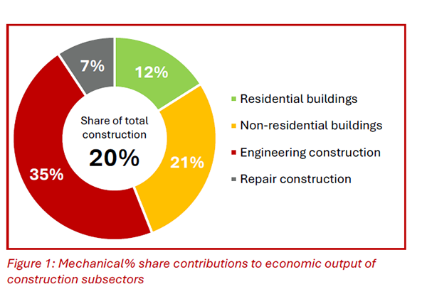 According to the report, approximately 20 per cent of 17Թ’s total construction output is performed by mechanical contractors. More specifically, mechanical contractors are responsible for 35 per cent of total engineering construction, 21 per cent of non-residential building construction, seven per cent of repair construction and 12 per cent of residential building construction.
